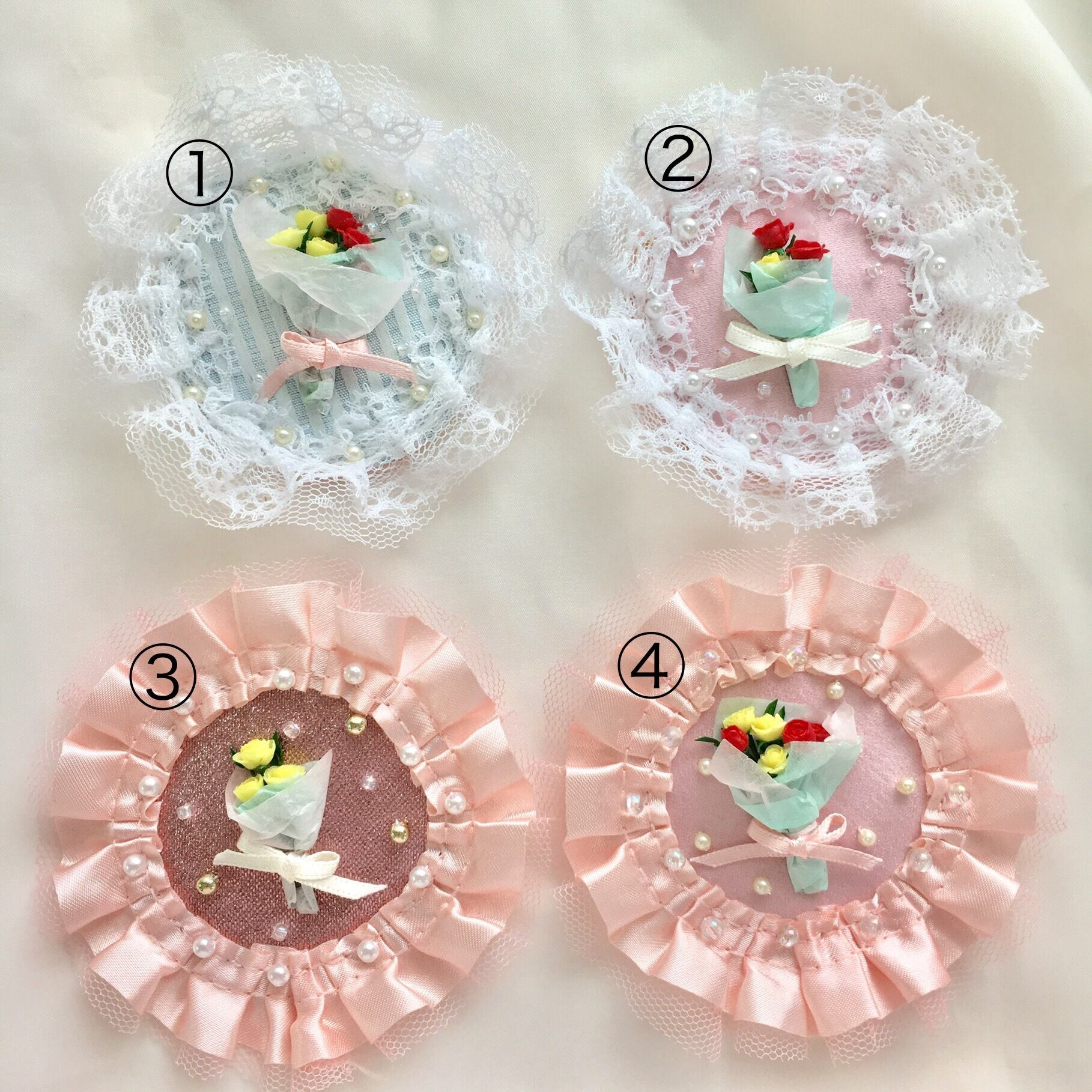 お花のバラは鮮やかな赤と黄色を使用し、華やかさをアップ!レースやパールをあしらい上品&可愛らしく仕上げました。