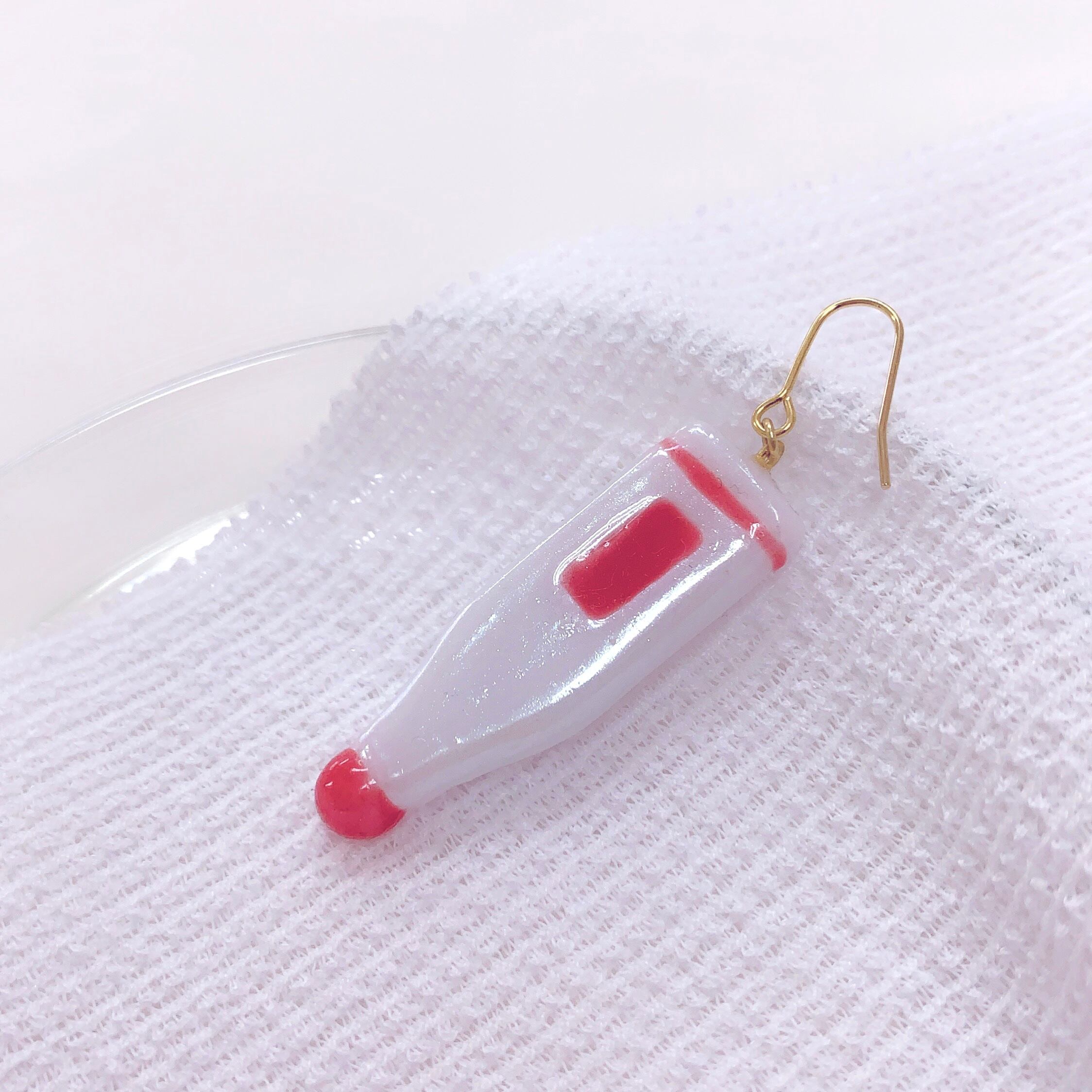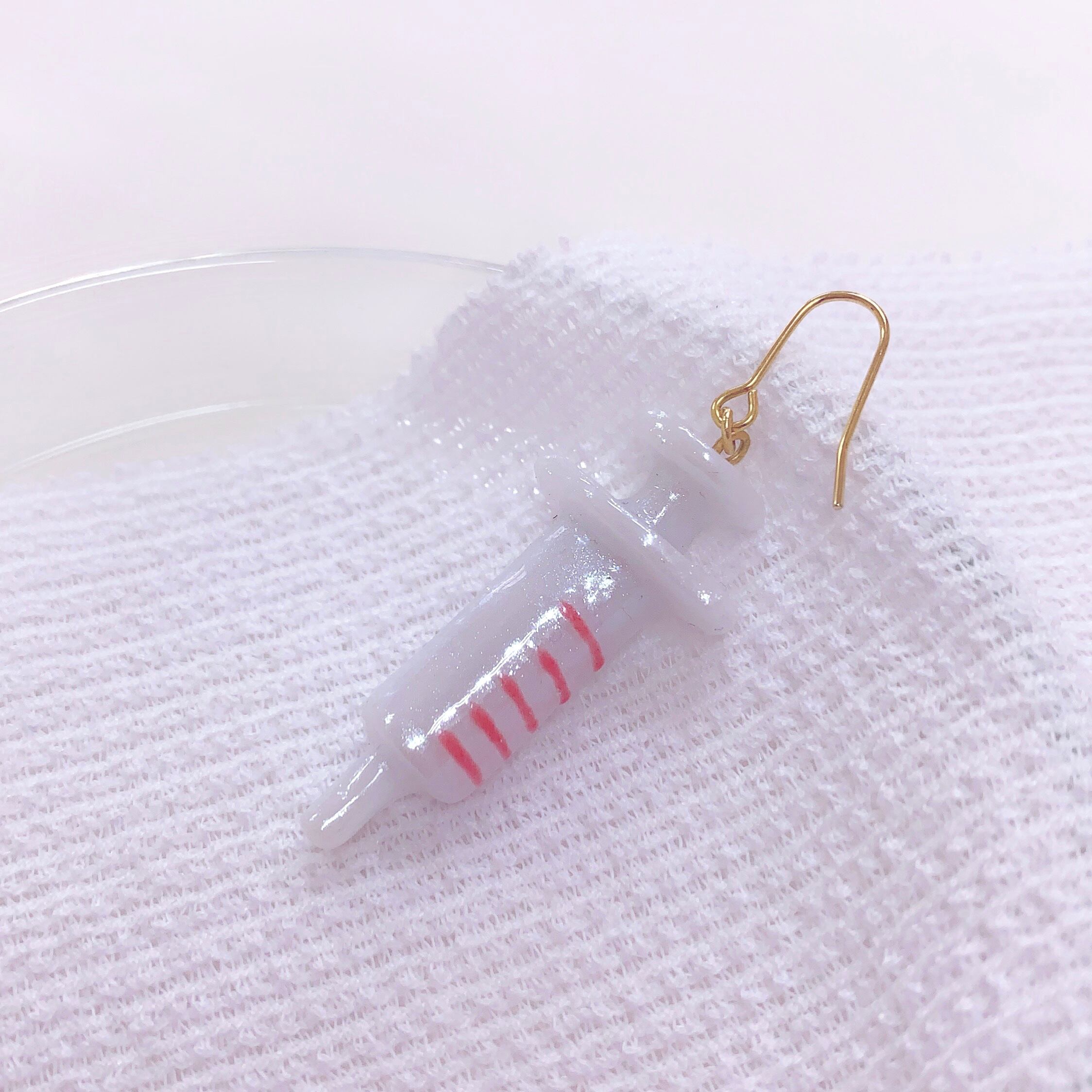 真っ赤な女性らしい色味の体温計・注射器ピアスです。
