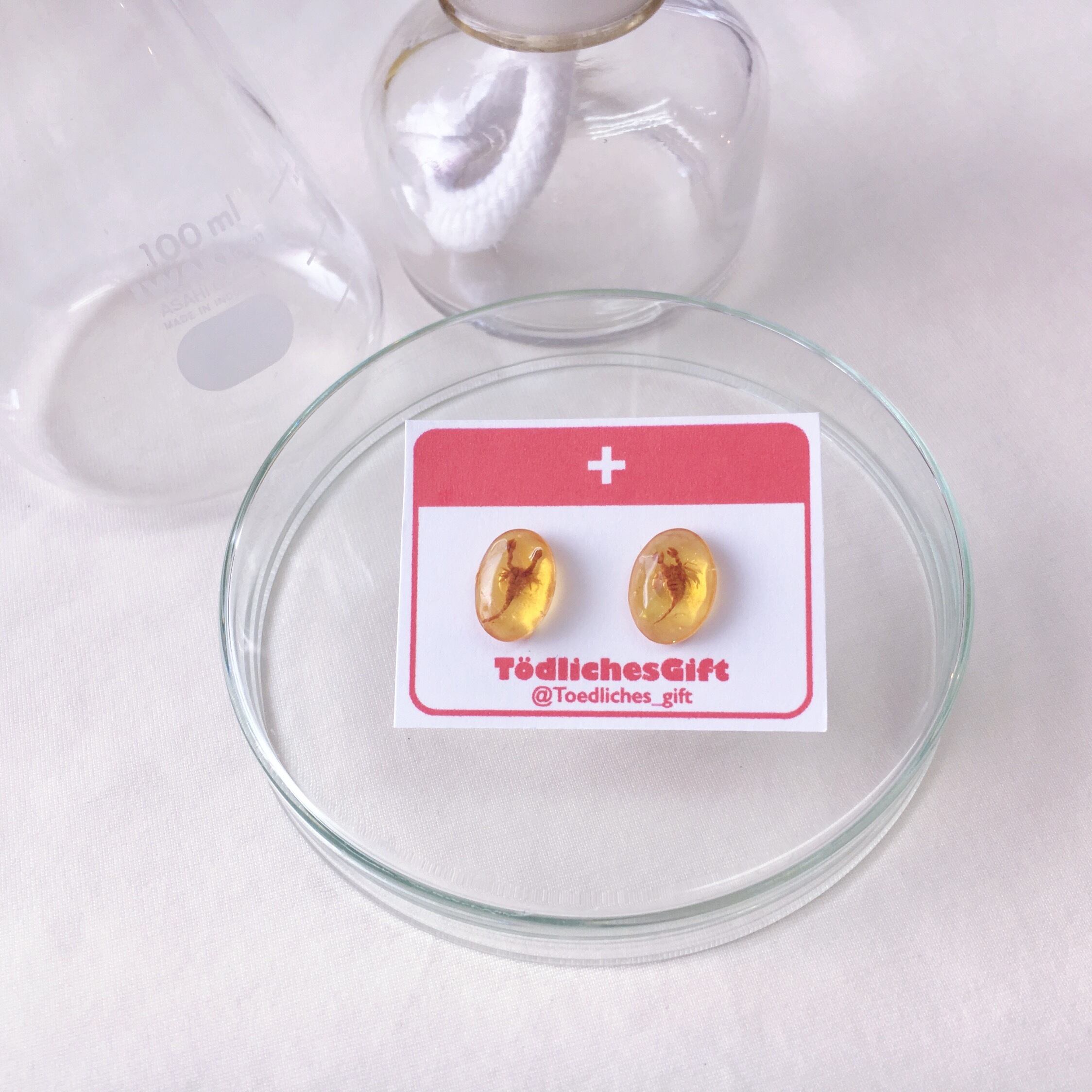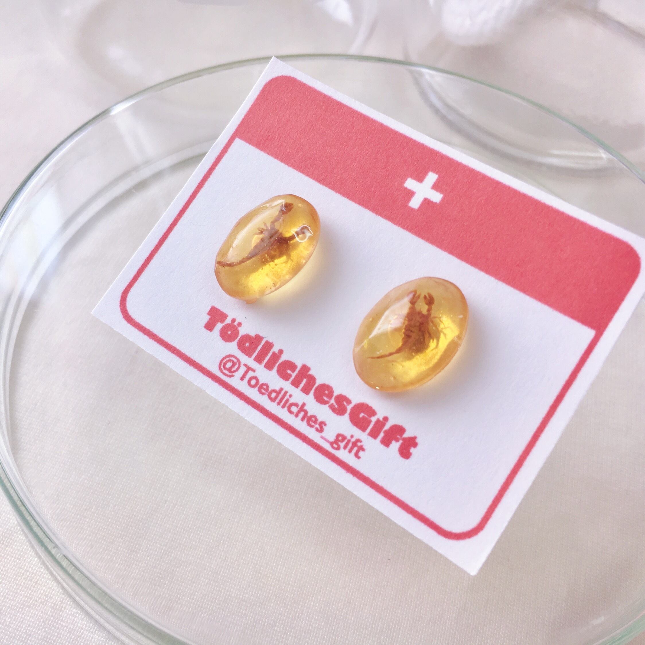 琥珀にサソリのミニチュアを閉じ込めた何ともアンティークなピアスです。