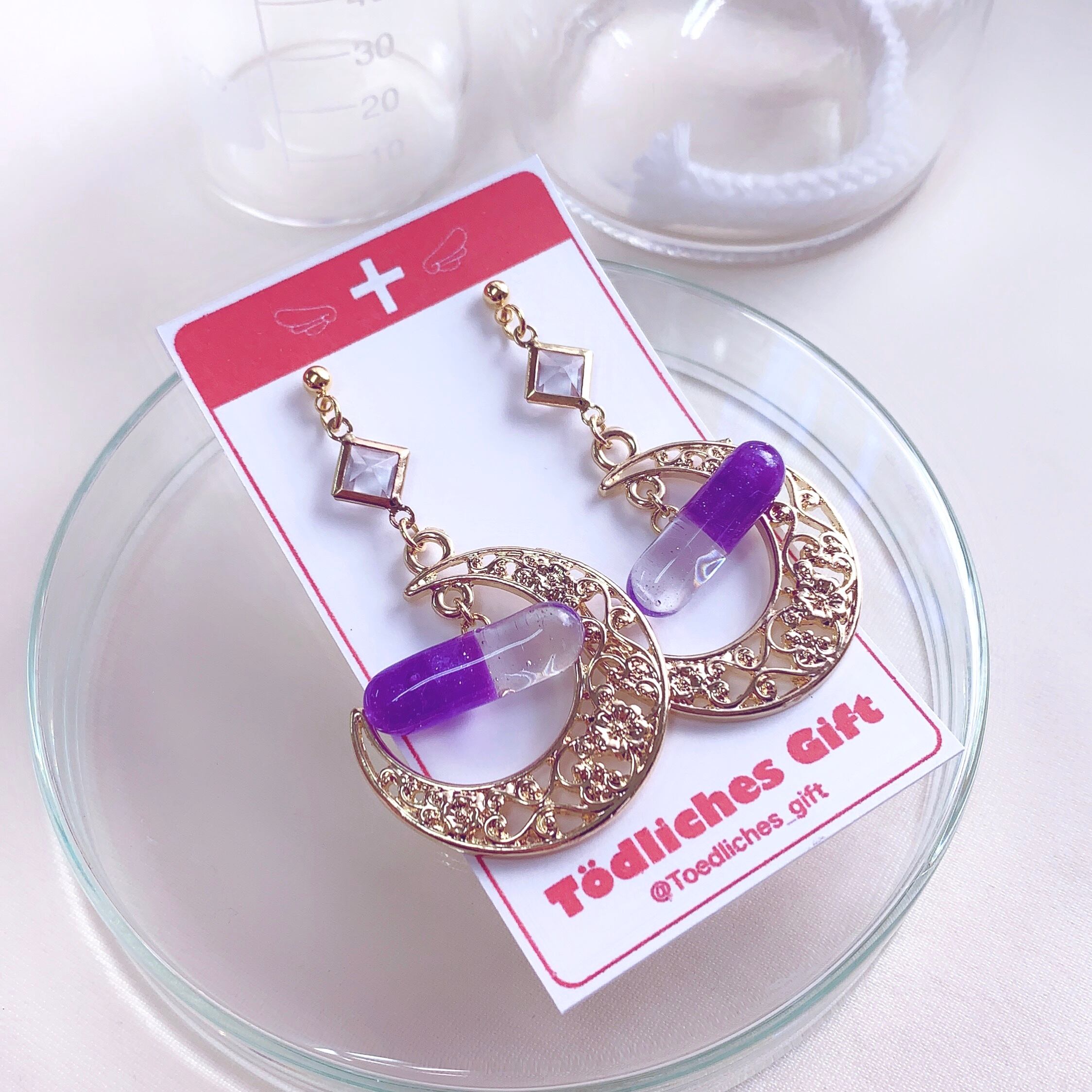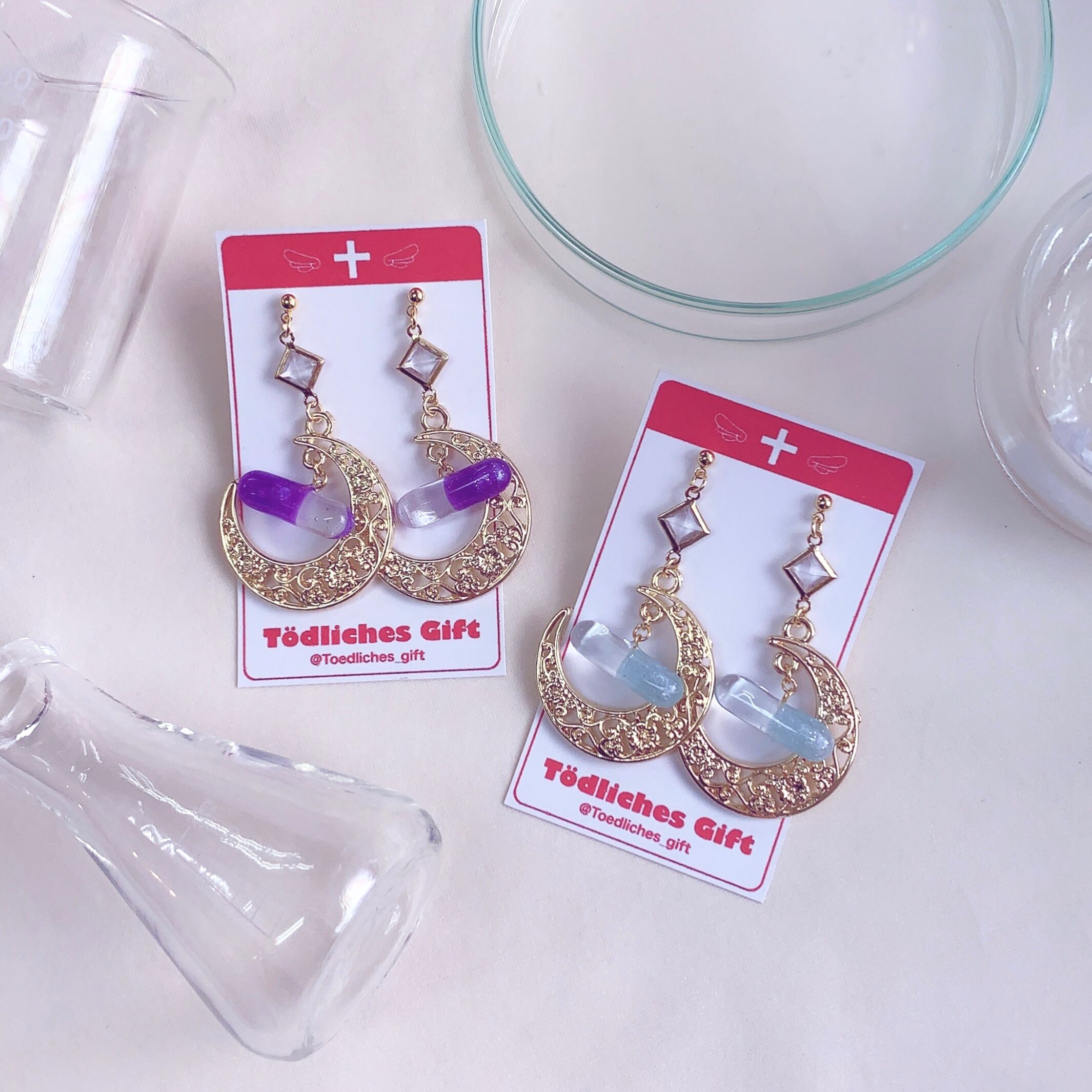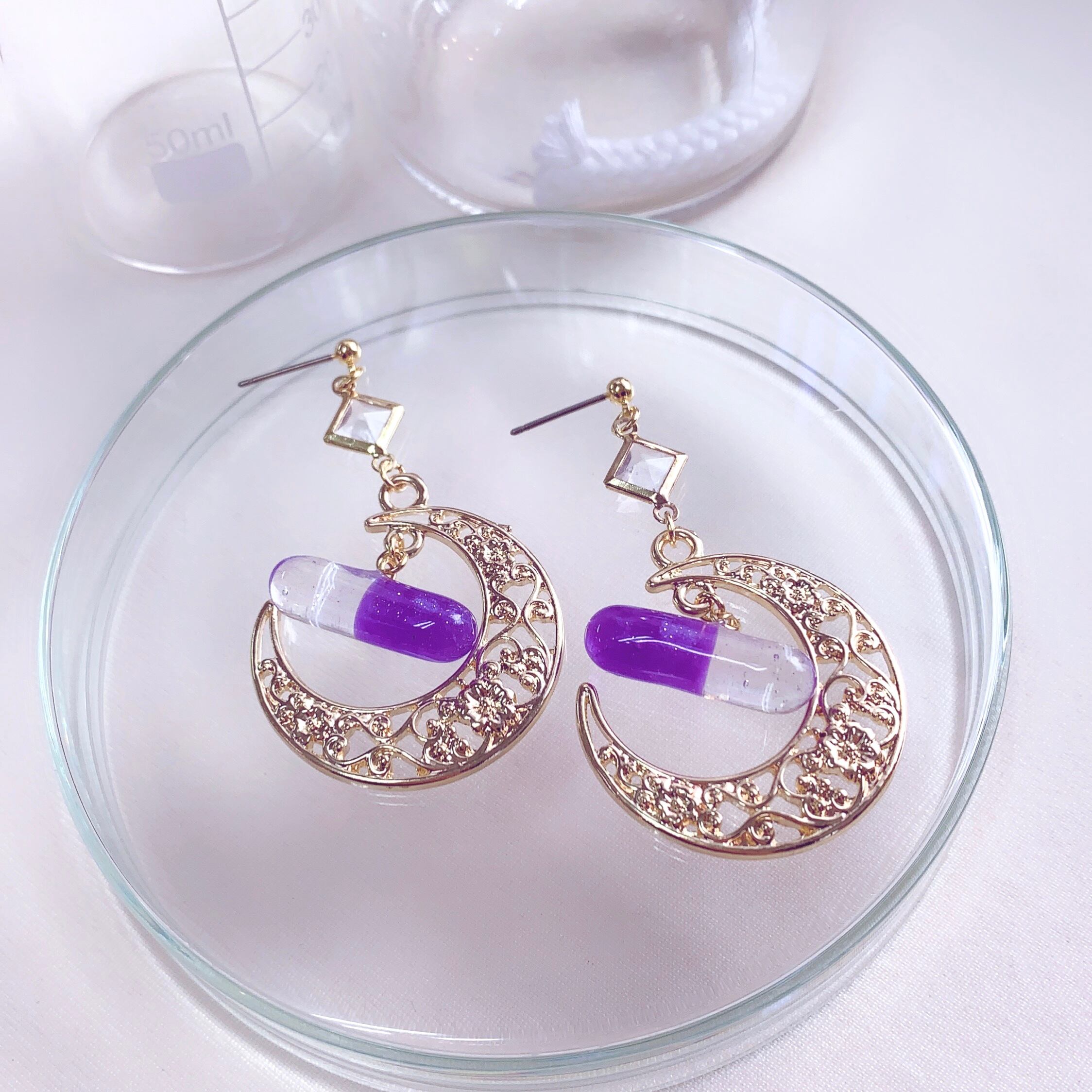 ゴールド透かしパーツとお薬・クリアパーツの組み合わせが大人っぽく、異国感あふれる大ぶりピアスです。