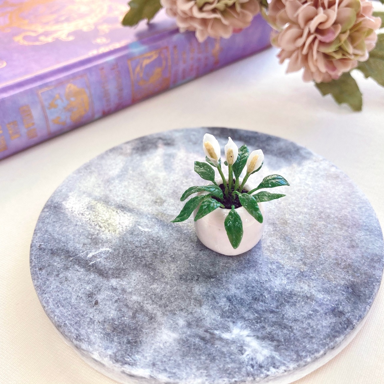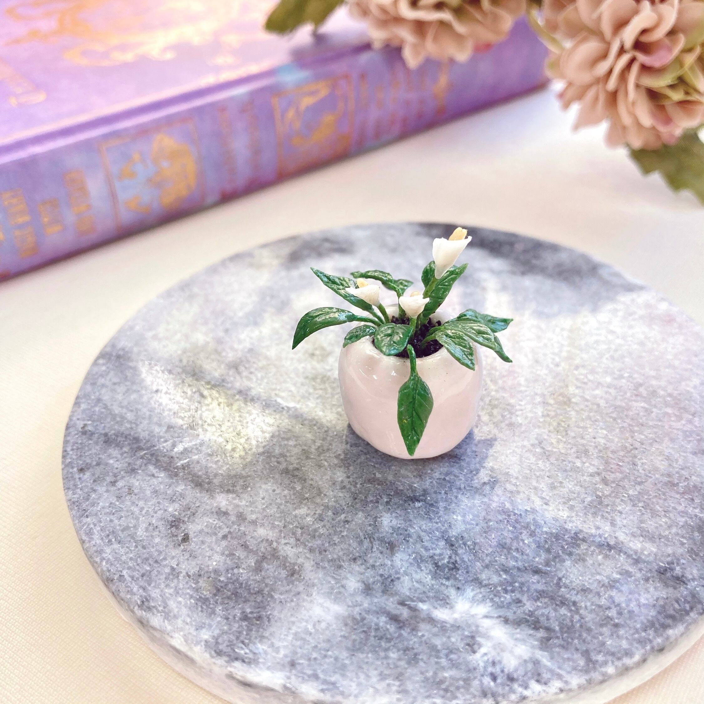 鉢のカラーは色々なお部屋に合わせやすい上品なホワイト。お人形さん・フィギュアにも合わせやすい12分の1サイズです。