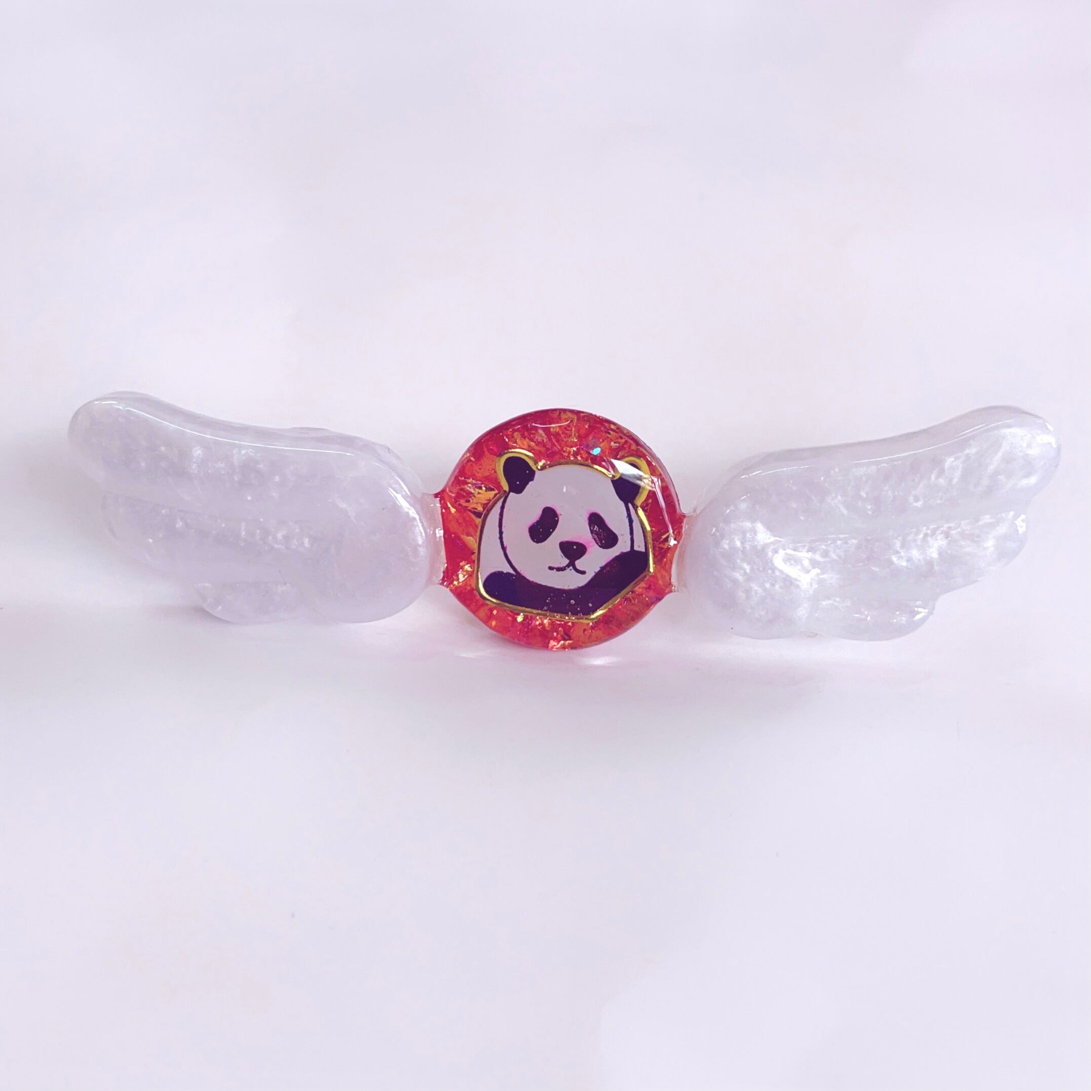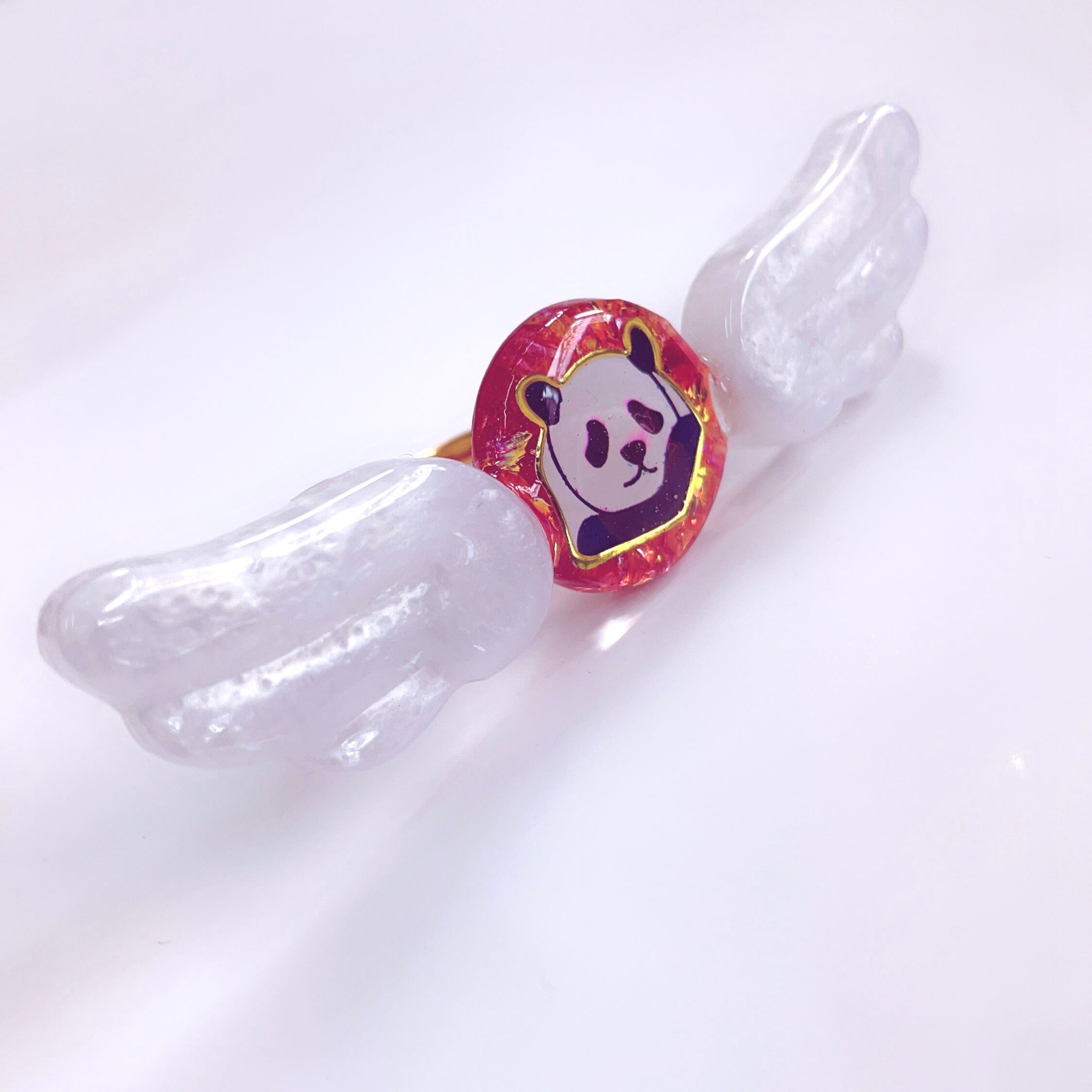 考え事をしてる風なパンダちゃんとパールホワイトの羽が可愛いリングです!