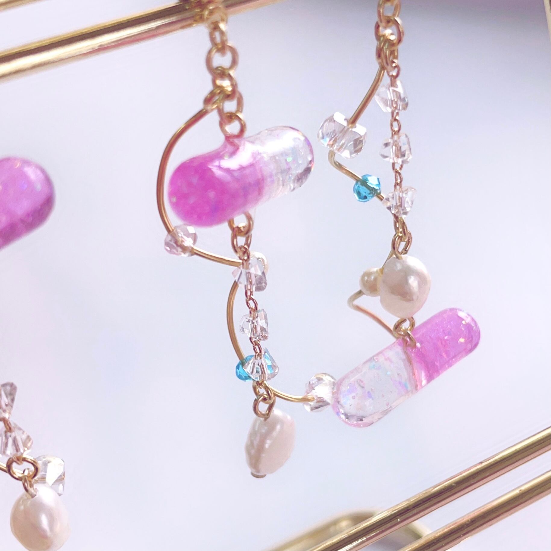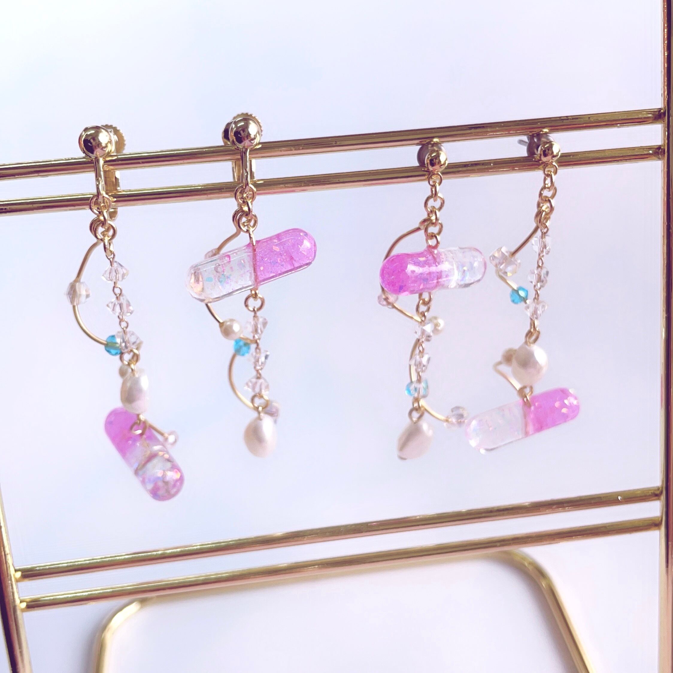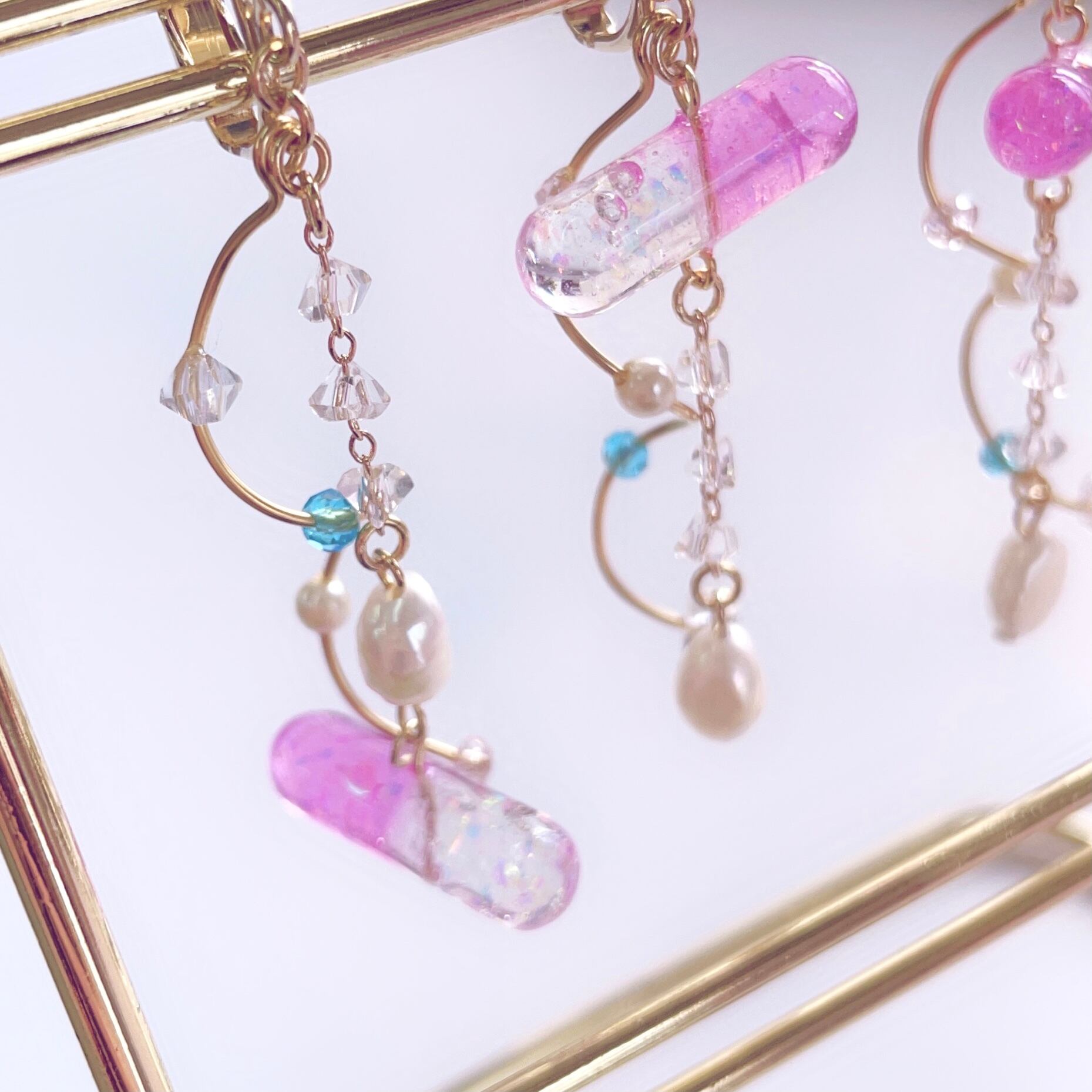 お薬パーツはラメやホログラムを封入し、ビーズもキラキラ揺れるパーツを使用してるのでお顔周りが一気に華やかになる一品です!