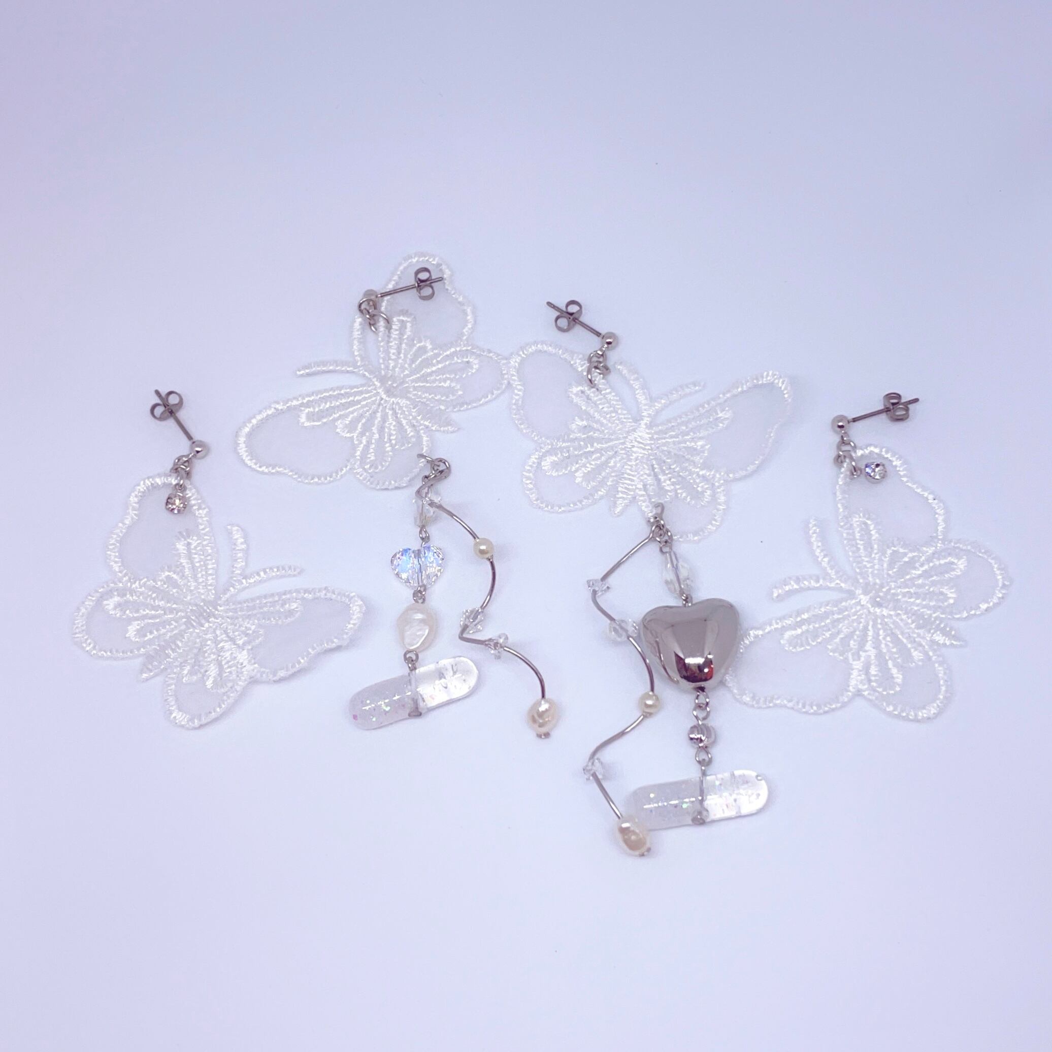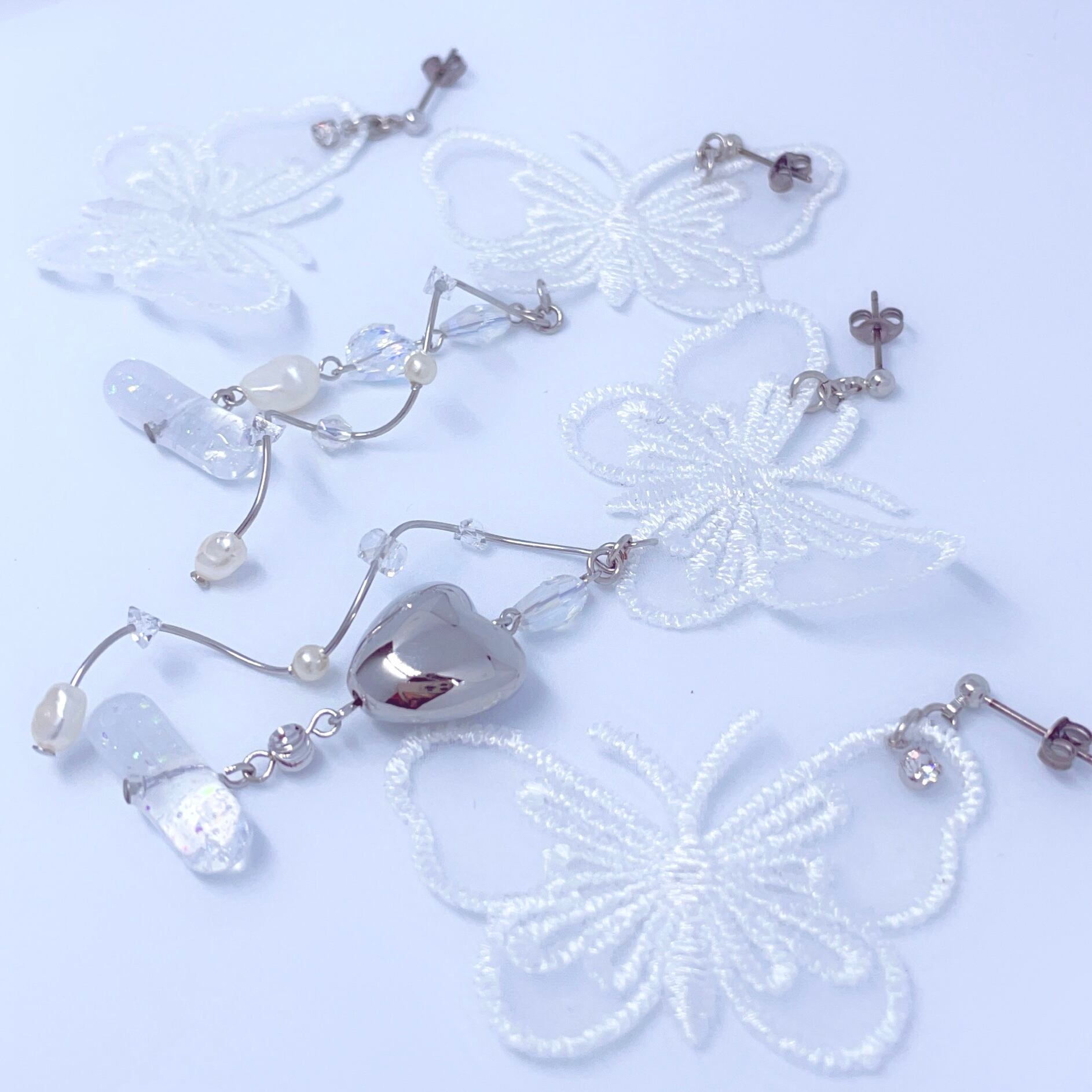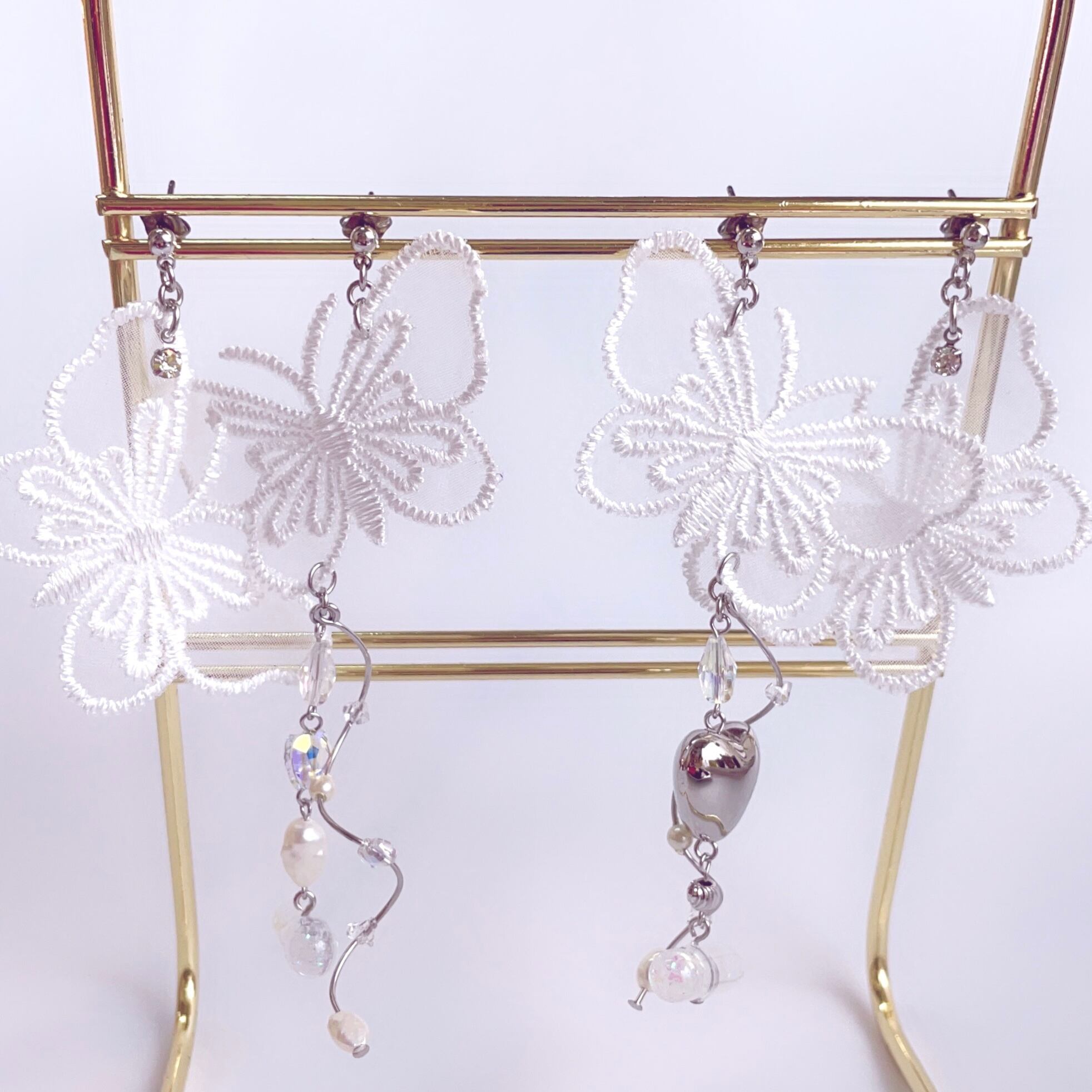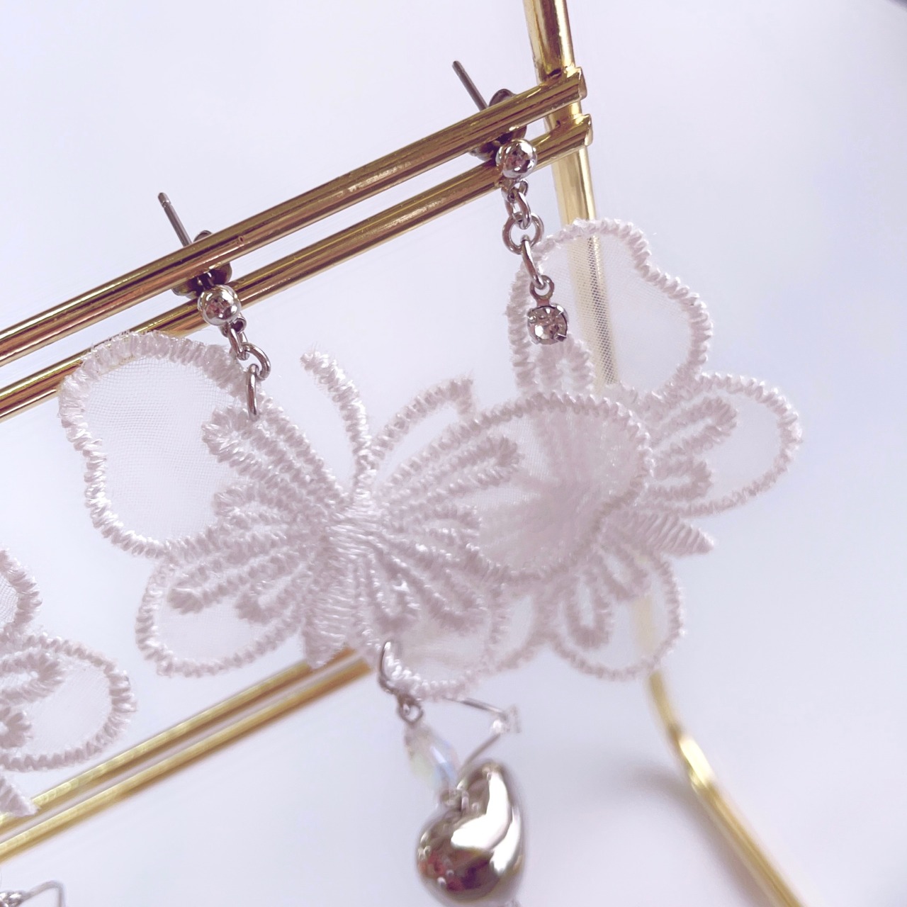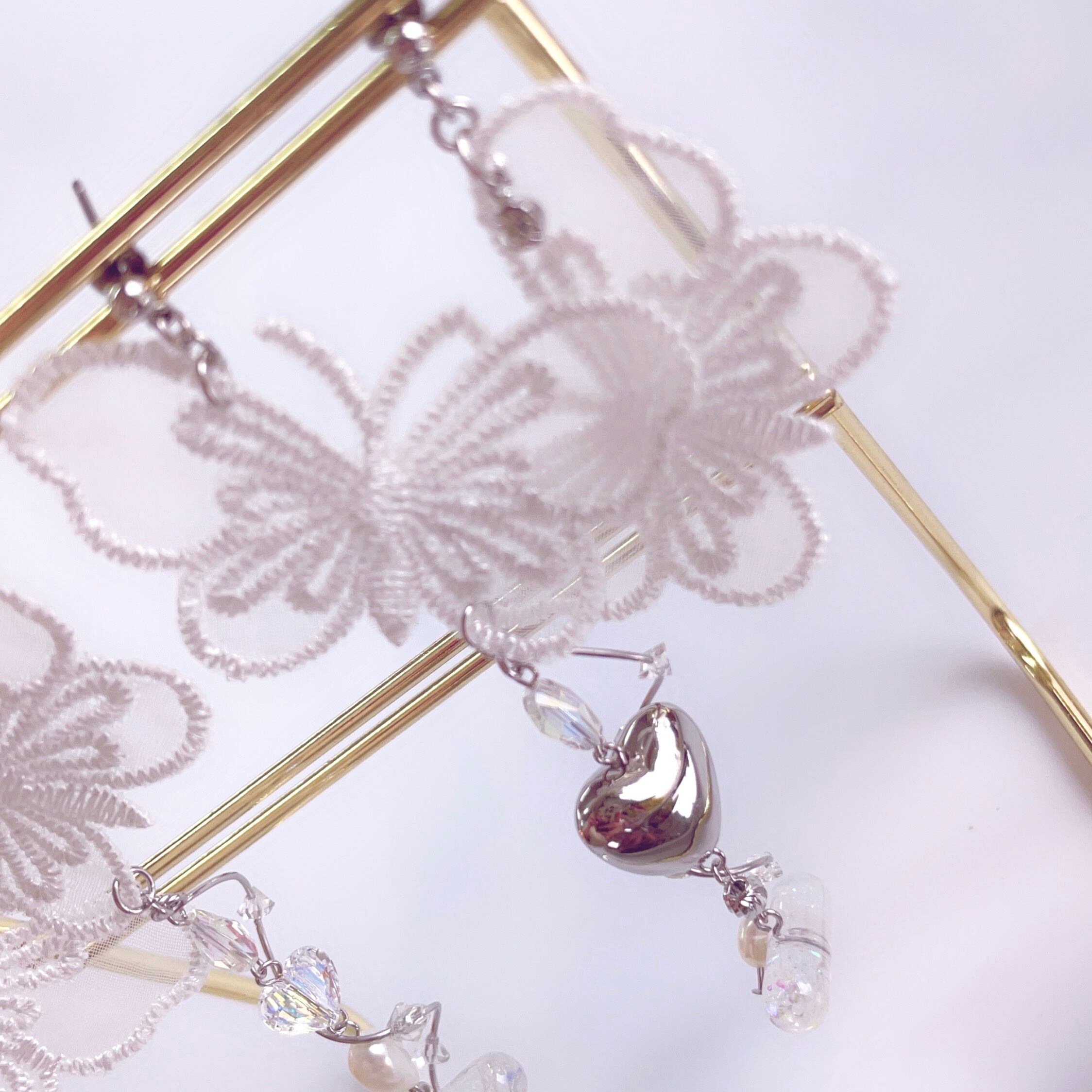 大ぶりな蝶と組み合わせパーツが揺れて、美しさに引き込まれるピアスです。