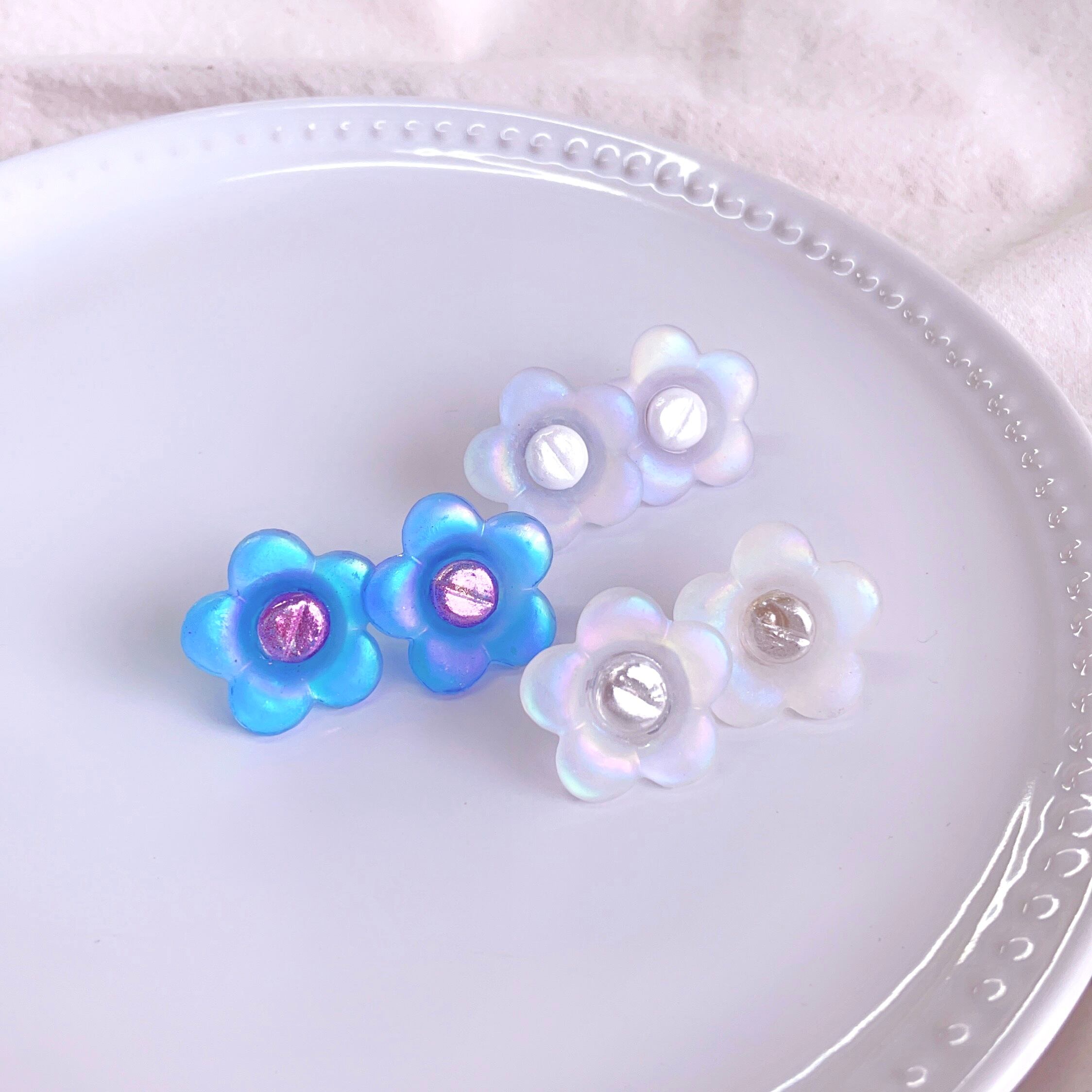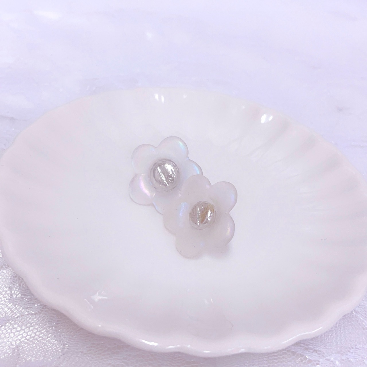 オーロラお花とパール系おくすりのマット×艶な組み合わせがかわいいピアスです。