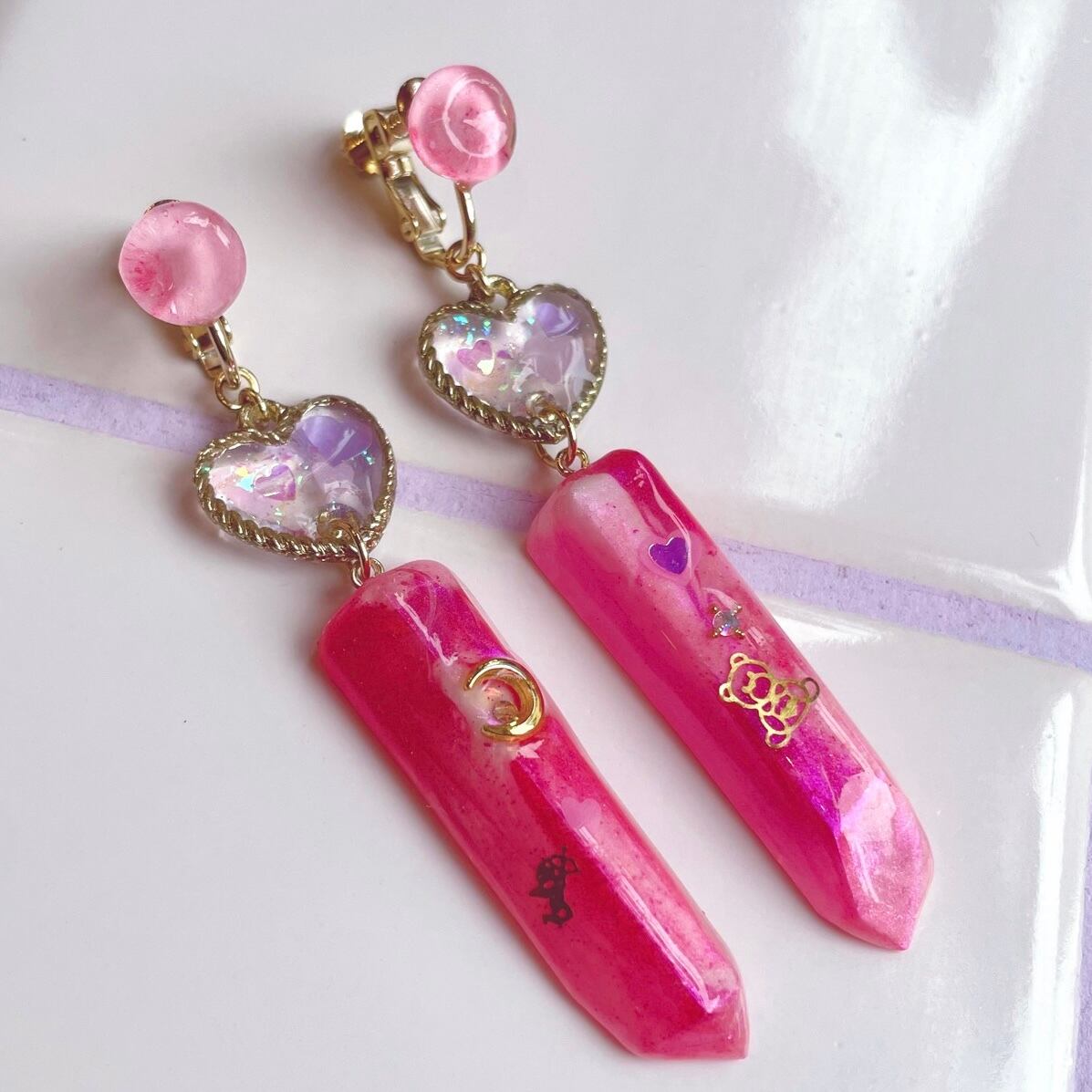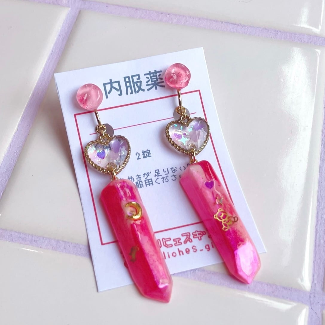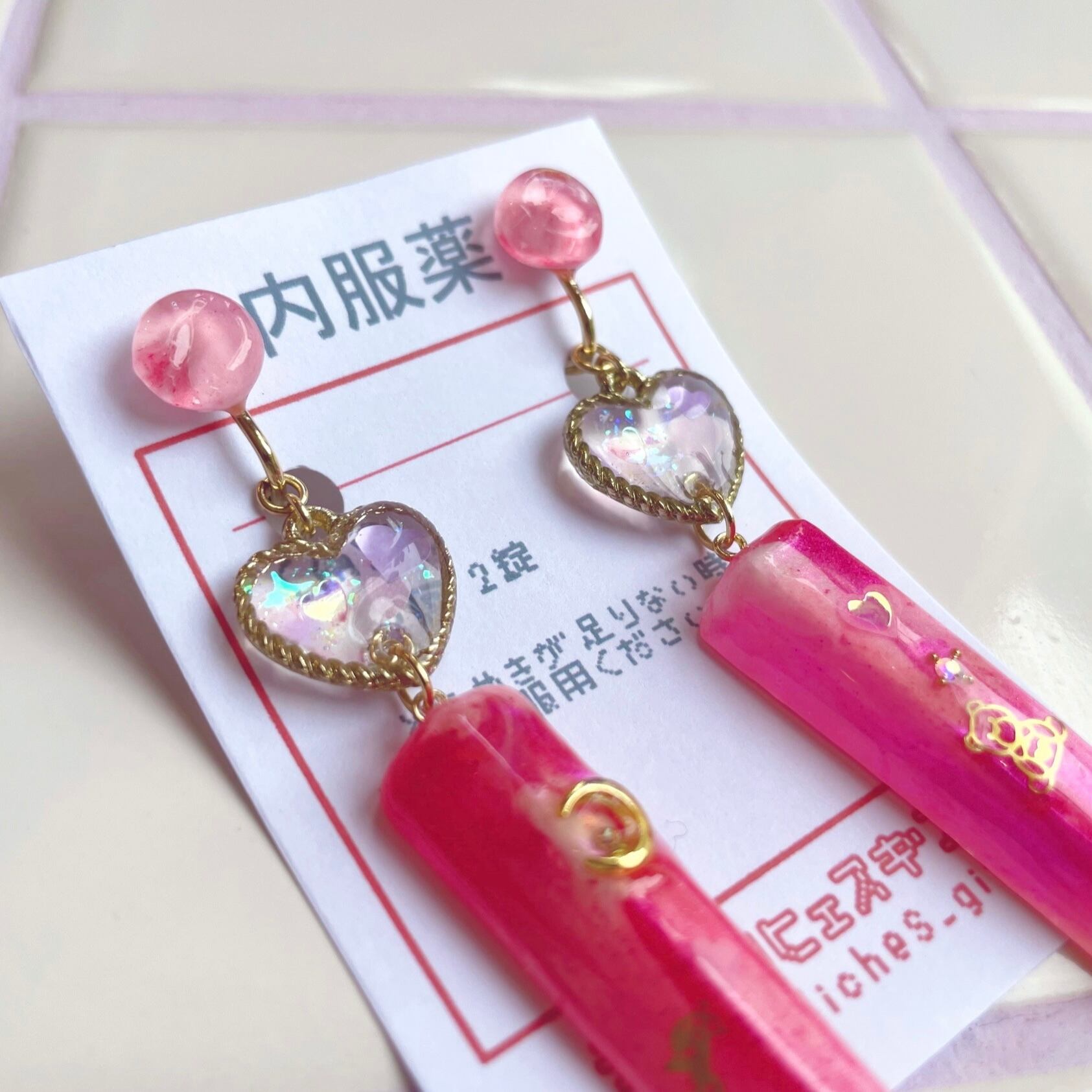 ド派手な色の沖縄の桜をイメージしたカラーの鉱石とオーロラフレーク封入のクリアハートパーツ、マーブルカラーおくすりの