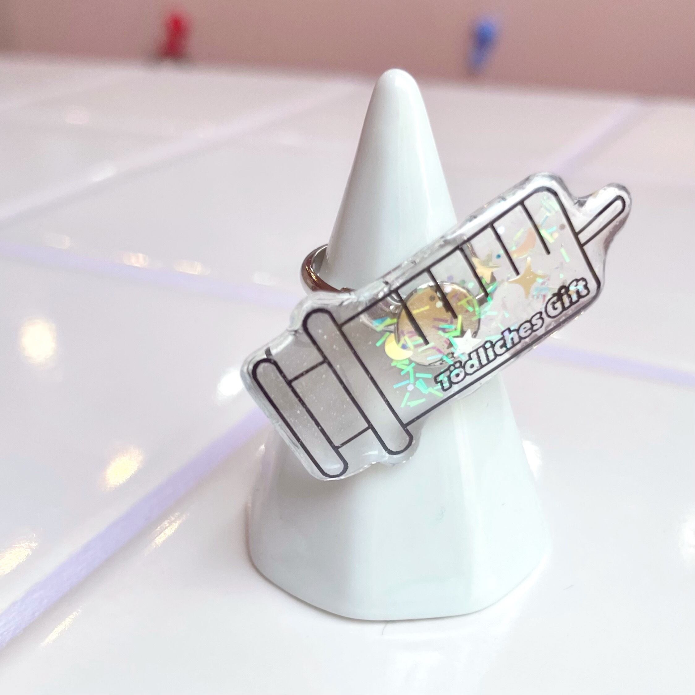 いろんなきらきらパーツを封入したクリアな注射器のリングです♪