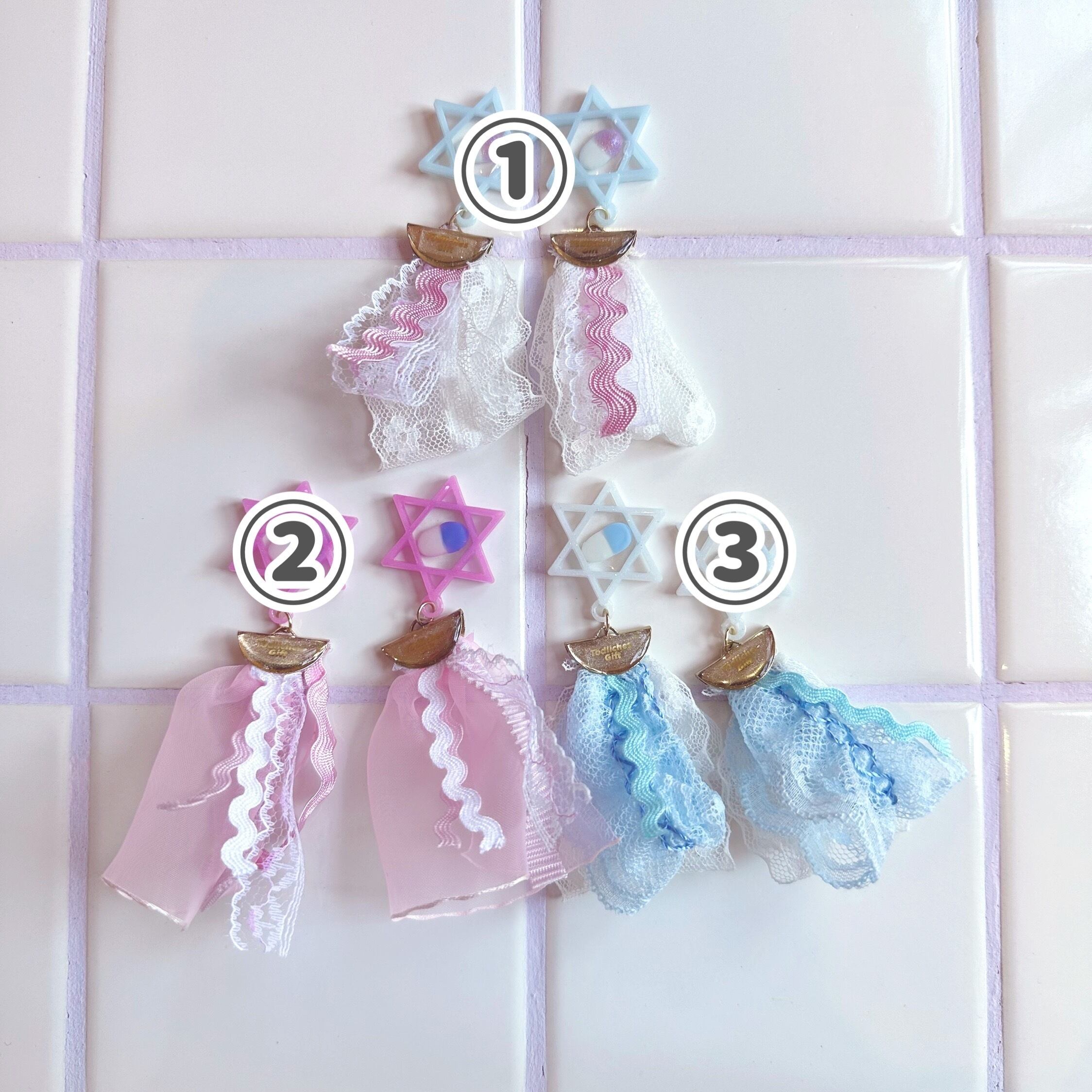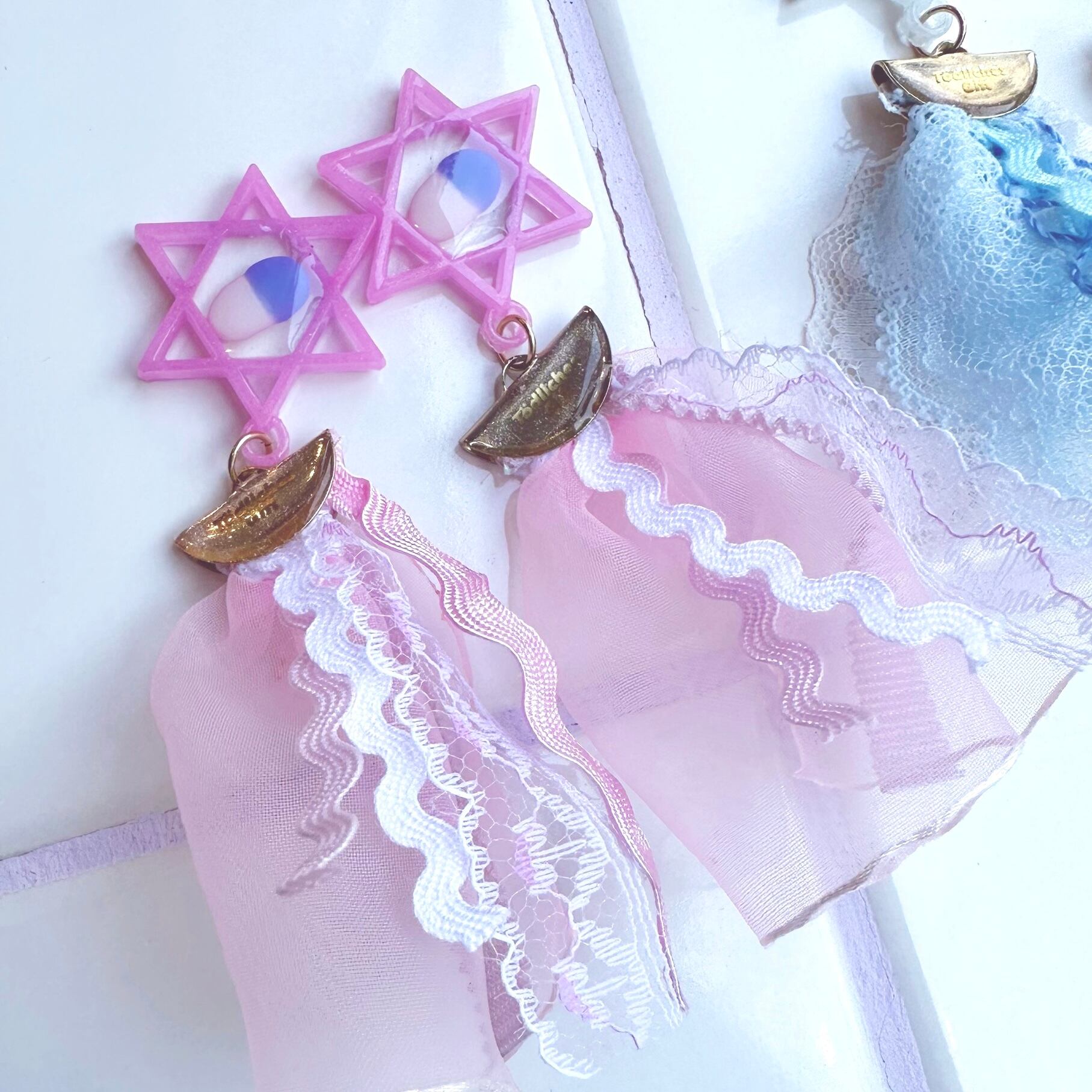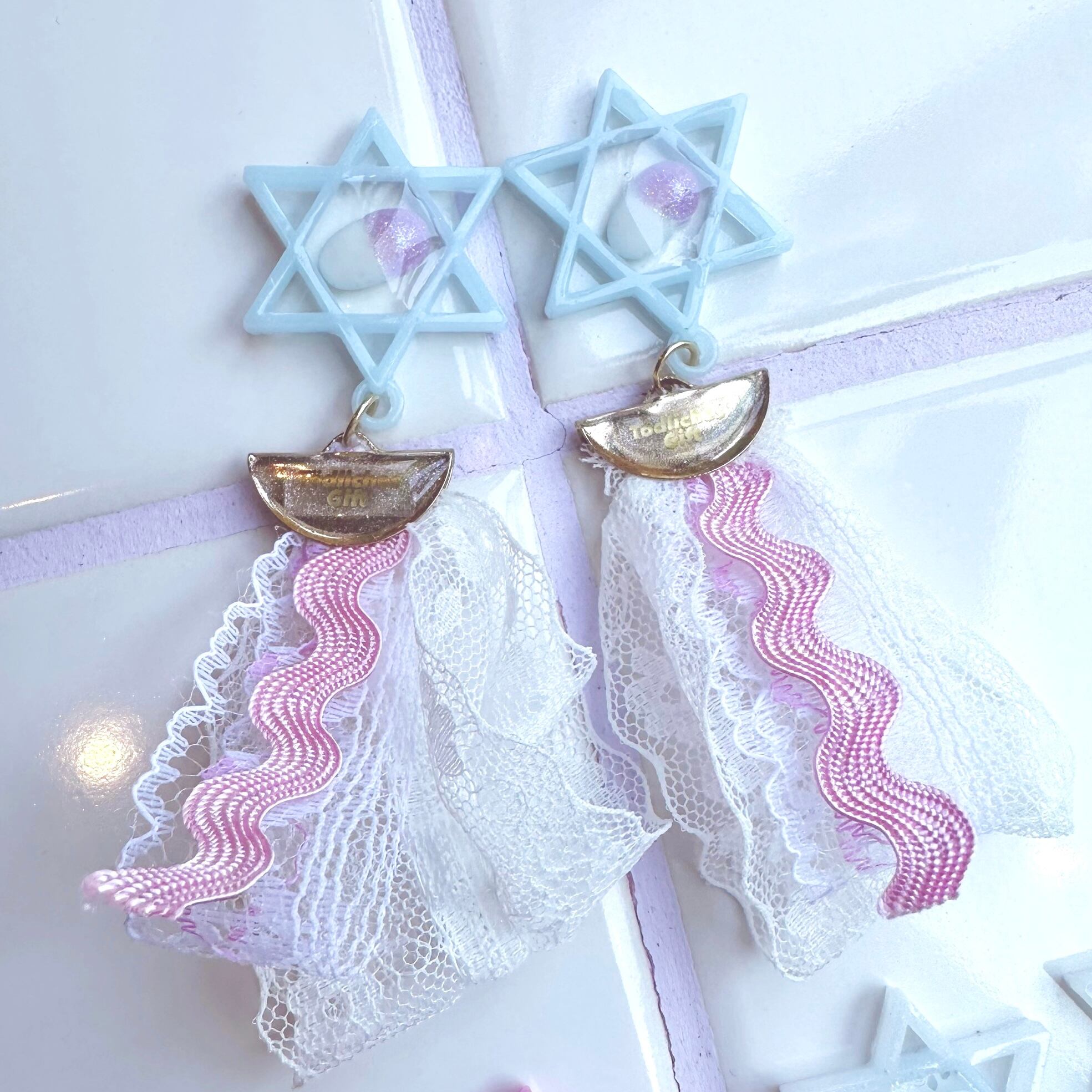 おくすりを埋め込んだ星とさまざまなレースで作ったタッセルのチャイナなデザインピアス ✧ˎˊ˗