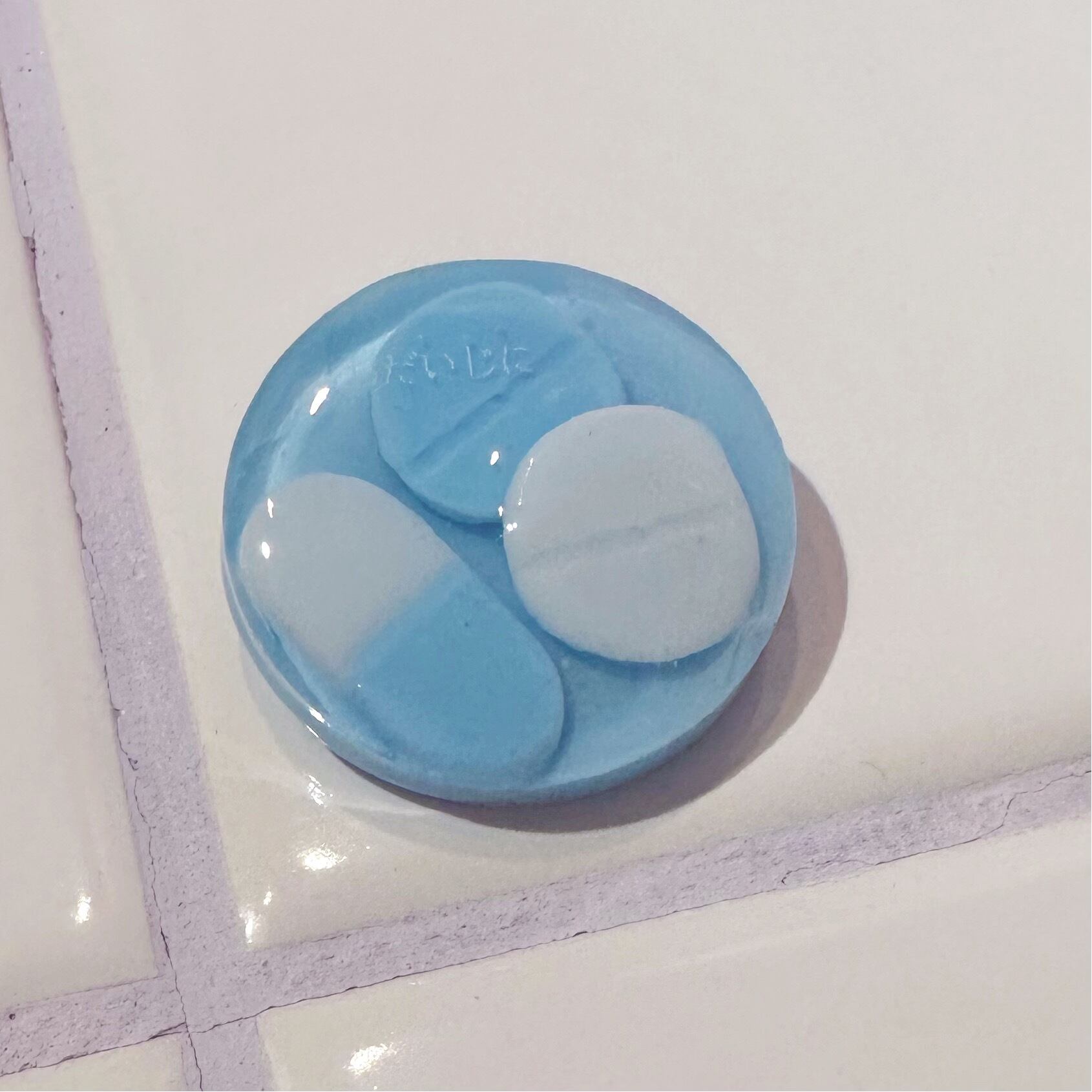 錠剤とカプセルをとじこめた、おだいじになさってくださいのきもちをブローチにしました。