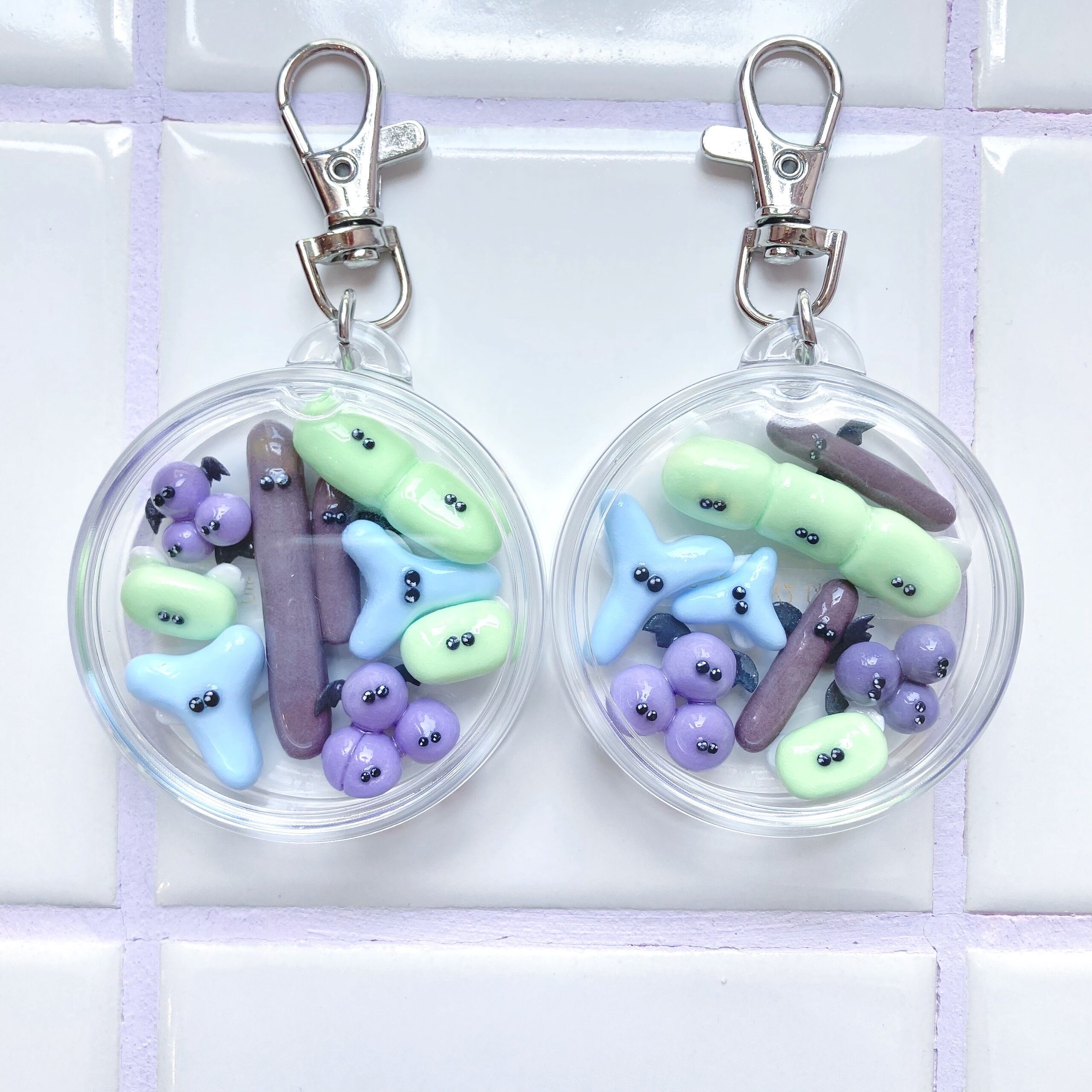 天使と悪魔の羽根が生えたぷりぷりの腸内細菌達をシャーレ風ケースに詰めたキーホルダーです◎